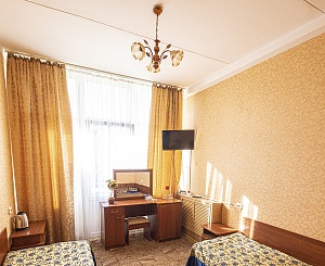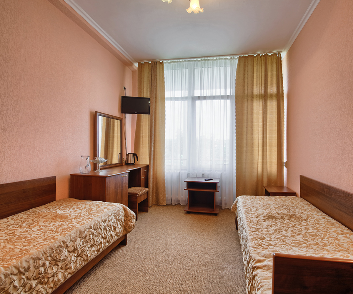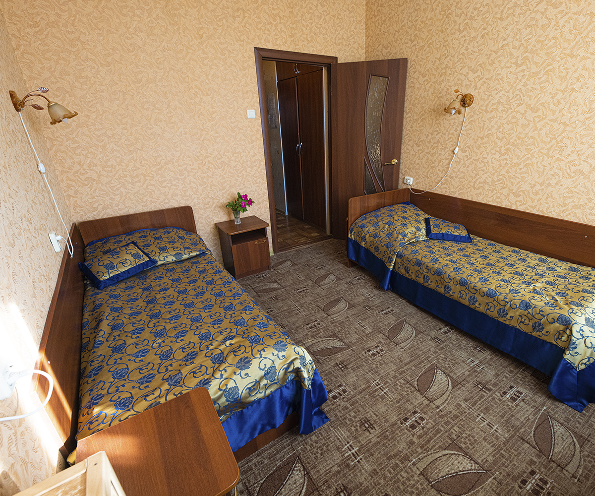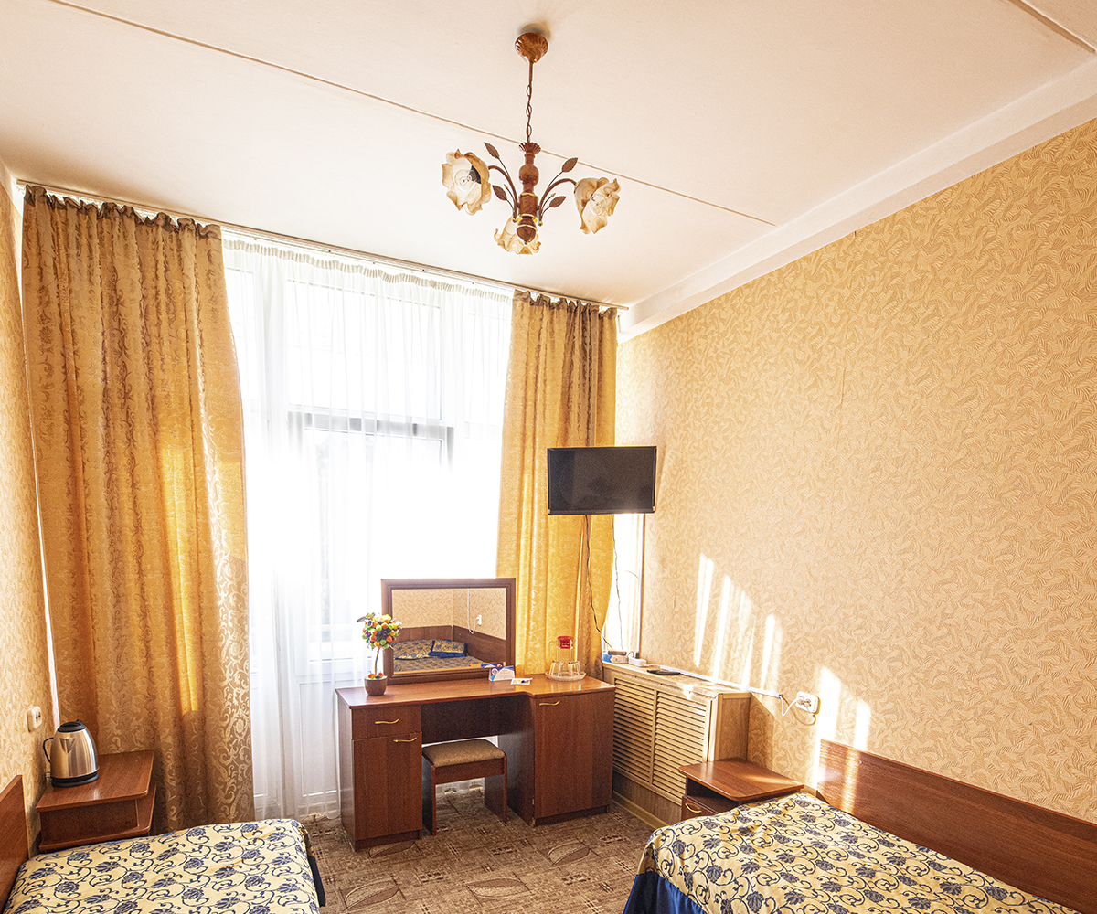 Комфортабельный двухместный однокомнатный номер первой категории, идеальный для отдыха и восстановления сил после насыщенного дня. Просторный, светлый интерьер включает раздельные кровати для двух человек, мягкую мебель, письменный стол и современную технику.