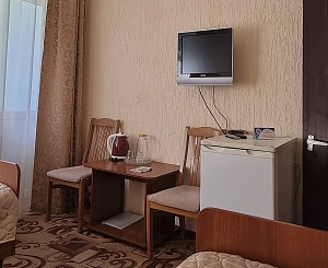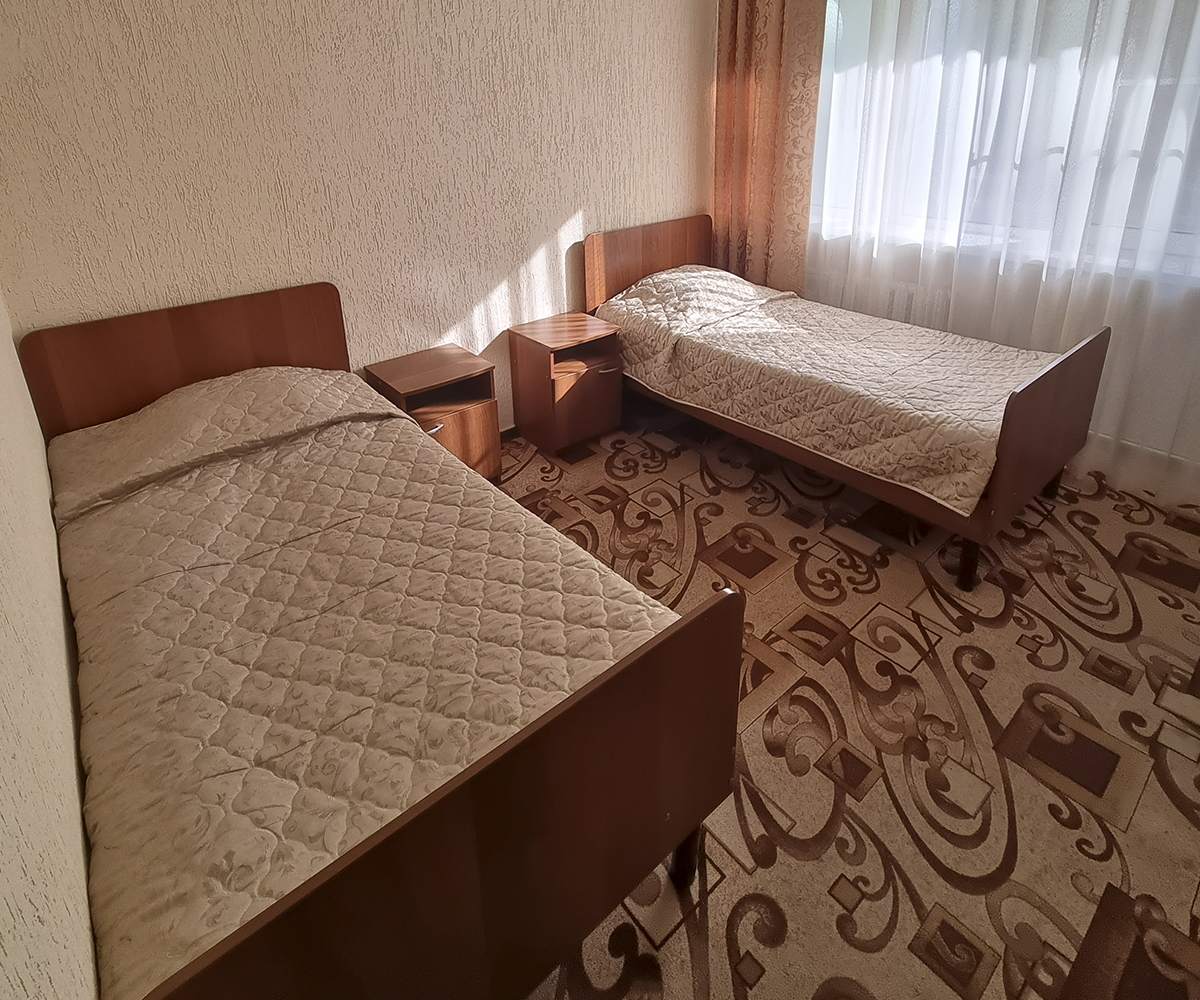 Номер для двоих отдыхающих. Отличный вариант для задушевных дружеских бесед или любования прекрасным закатом с балкона. В номере уютный интерьер, две раздельные кровати.