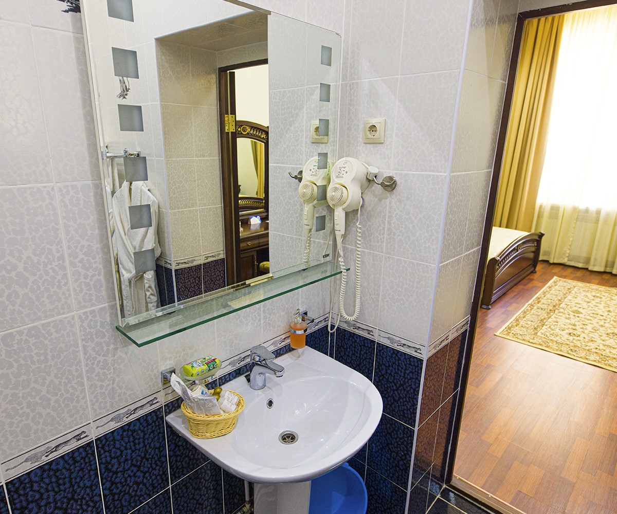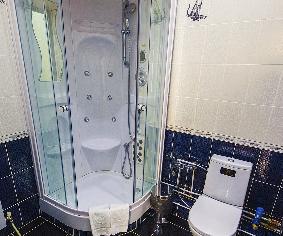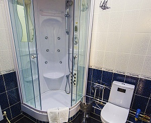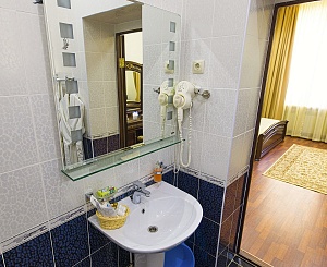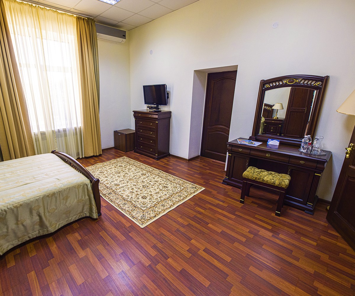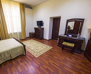 Современные удобства включают телевизор, холодильник, электрочайник, и фен. Приятным дополнением станет ванная комната с душевой кабиной и качественными туалетными принадлежностями. Каждый день вас будет радовать великолепный вид на старинный центр города Ессентуки, создавая атмосферу былых лет, спокойствия и уединения.