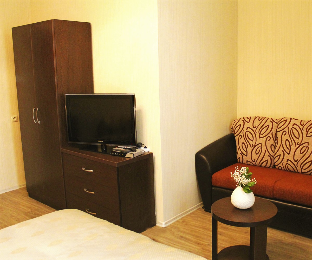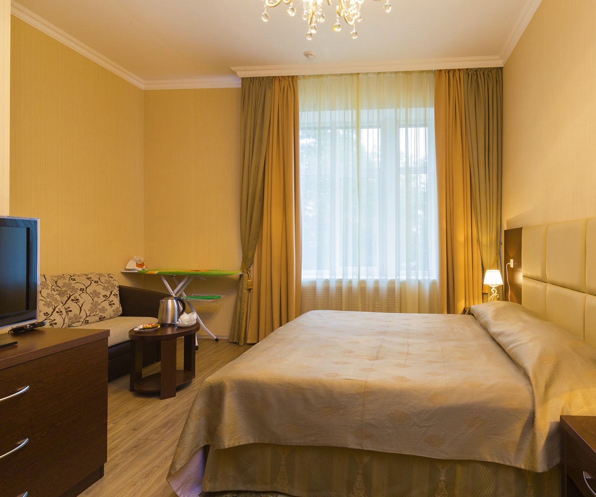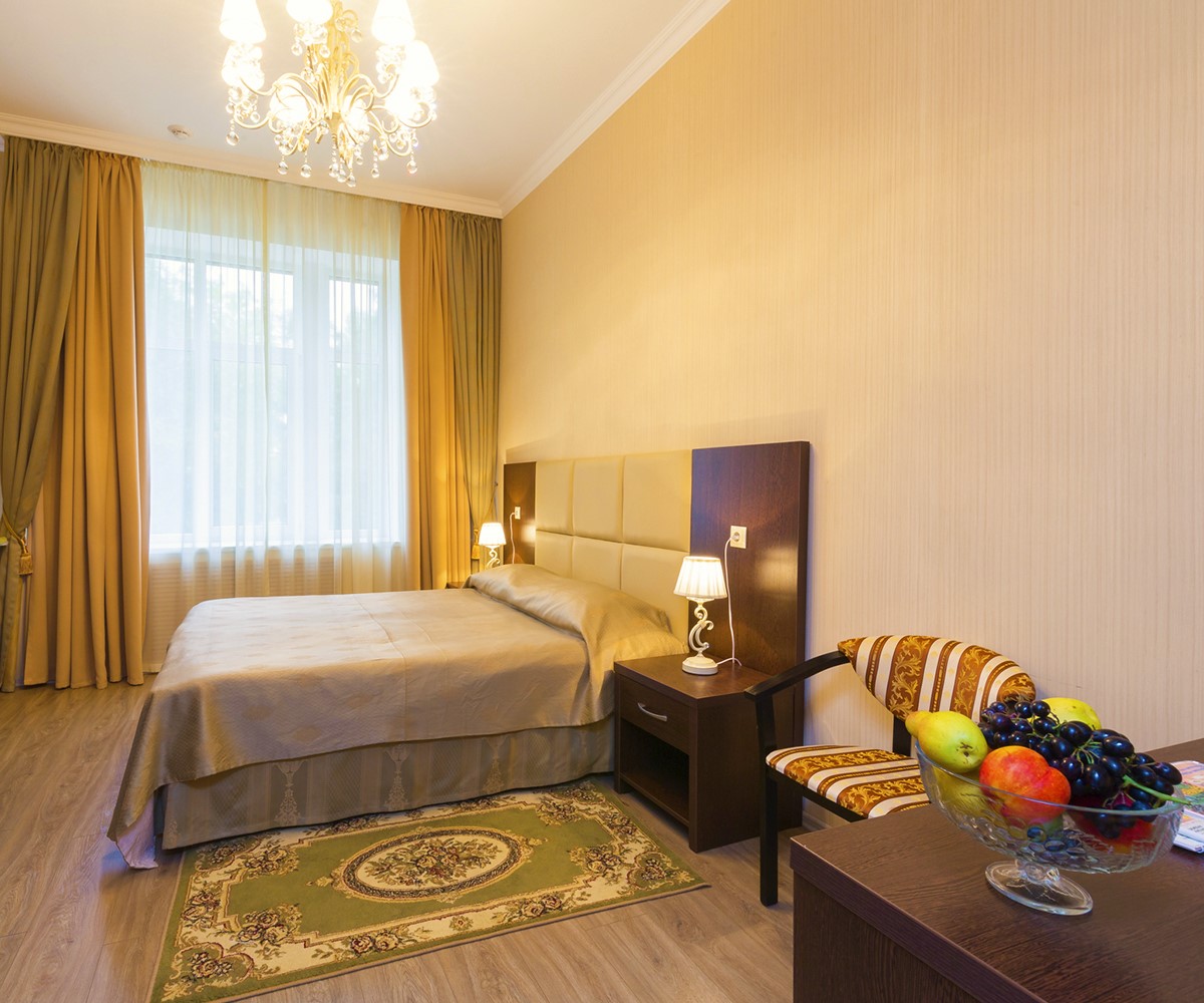В двухместном люксе мы постарались предусмотреть все, что обеспечит вам комфорт пребывания в городе Ессентуки. Мы установили систему индивидуального климат-контроля, подключили кабельное телевидение. В каждом люксе - мини-бар. И конечно, мы всегда прислушаемся к вашим просьбам и пожеланиям, потому что хотим обеспечить вам не только удобство проживания, но и, при необходимости, возможность вести дела.